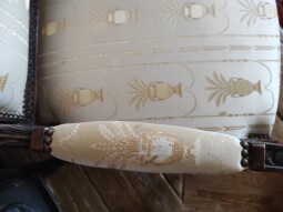 Krásne masívne vyrezávané starožitné kreslo, drobné poškodenie čalúnenia na podrúčke (viď foto)